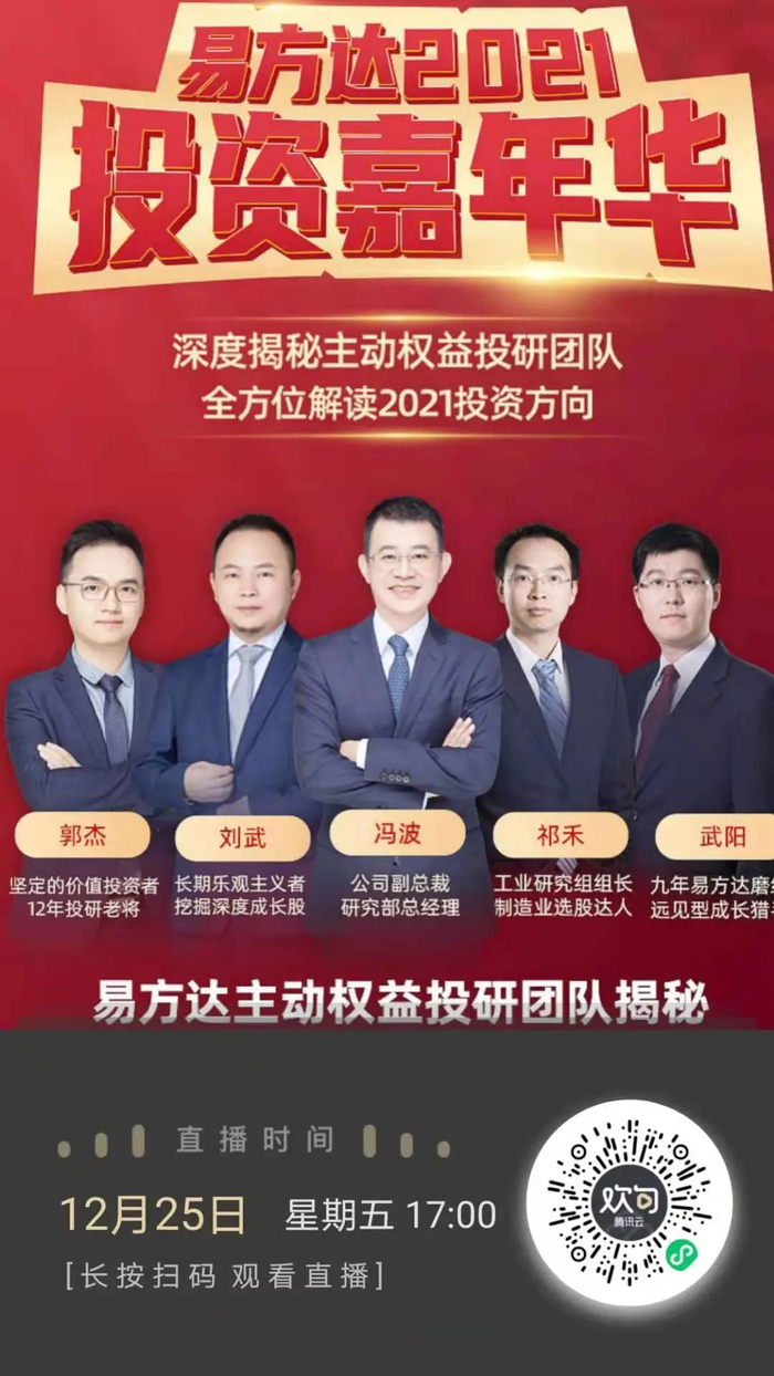还有5天,2020年将过,2021年到来,面对2021年,多家基金公司发布展望,前天(12月25日),易方达2021投资嘉年华开启线上直播,作为业内少有的管理总规模超万亿的基金公司,易方达基金的投资嘉年华,我是必看的。