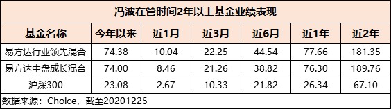 易方达行业领先混合自2010年起由冯波管理,十年的期限比较完整的反映了基金经理的管理能力。Choice数据显示,该基金2019年收益率高达62.93%,今年以来涨幅74.38%,过去两年收益率达到181.35%。
