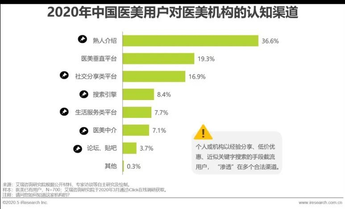 与此同时,艾瑞咨询数据显示,中国医美用户通过医美垂直平台对医美机构进行认知的比例不足20%。