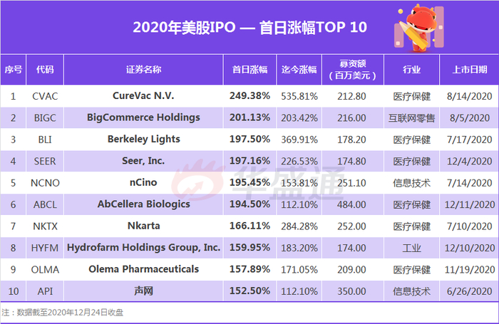 其中,以249.38%的惊人涨幅位居首日涨幅第一位的,更是今年最最当红的“头牌”新冠疫苗赛道的CureVac。而云通信服务商声网也以152.5%的首日涨幅上榜第十,为中概股夺得一席之位。