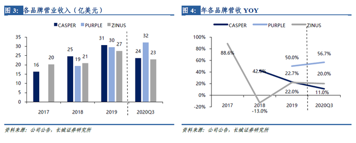从各品牌的收入体量来看,2019年Casper以31亿美元领衔互联网品牌,Purple以30亿美元紧随其后,Zinus录得27亿美元。三大品牌体量相差不大。从增速角度来看,Zinus虽然于2017年高速增长,但是在反倾销下东亚产能受到影响,收入增速呈现较大波动,2019年相对2017年恢复正增长。Casper与Purple2019年以来分化明显,Purple的增速环比增长至50%,而Casper下滑至22.7%,2020年前三季度两者增速分化愈发明显。