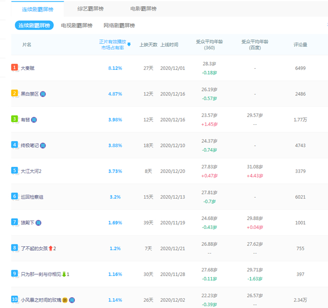 来自云合数据的12月17日日榜显示,《大秦赋》位居连续剧霸屏榜第一。(来源:云合数据)