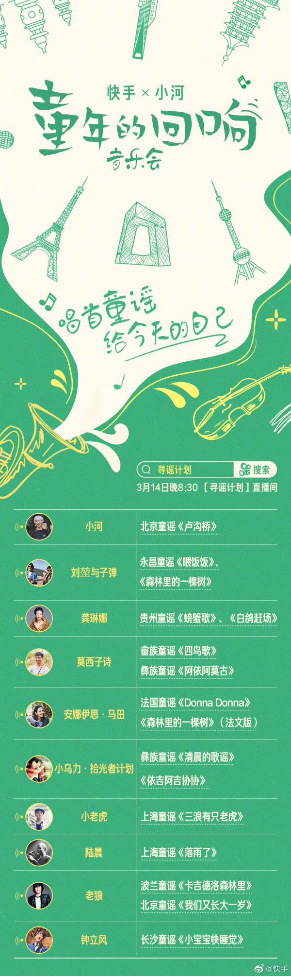 3月14晚,音乐人小河的“寻谣计划”线上音乐会在快手开播,龚琳娜、老狼、莫西子诗、刘堃、陆晨、钟立风等音乐人在各自的空间接力演唱古老童谣,实时在线观看人数超过150万。2018年开始的“寻谣计划”包括寻找童谣、重新创作、现场音乐会、周边开发等完整链条,往常在每座寻谣的城市都会举办数场现场音乐会,参与人数不超过50人。在快手,观看人数呈几何级数炸裂。