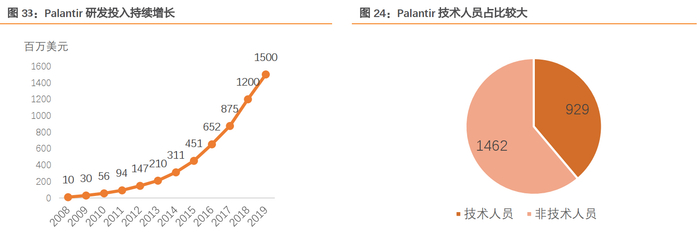 一直以来Palantir都重视研发能力的培育,表现为技术人员占比较大且研发投入持续增加。2018年底,Palantir开始招聘直销人员,他们的主要职责是向特定客户和特定地区销售软件。