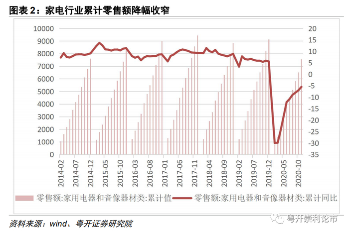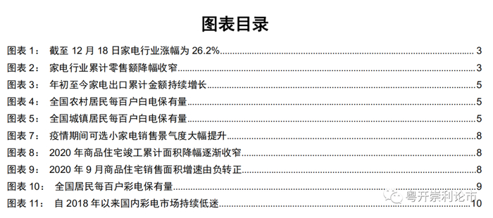 截至 11 月,家电行业累计零售额为 7565.5 亿元,同比降幅收窄至-5.5%,线下零售 渠道受阻,业绩所受冲击较大,但家电企业积极开展渠道变革,布局线上市场,通过网 络直播带货等方式弥补线下渠道的损失,随着疫情形势缓解,全面复工复产,行业整体 业绩降幅逐渐收窄。