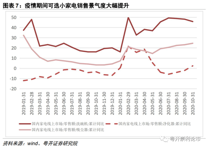 在消费升级背景下,小家电行业由于个性化程度较强,且无需上门安装,展现出强大的市场活力。以洗碗机、净化器、吸尘器为代表的的可选小家电在疫情期间逆势上涨,销售景气度持续上升,特别是市场渗透率较低的可选厨房小家电。目前我国小家电整体市场渗透率不足30%,而发达国家渗透率维持在50%左右,在必选家电呈现饱和的情况下,保有量低的可选小家电仍然有巨大的增长潜力。
