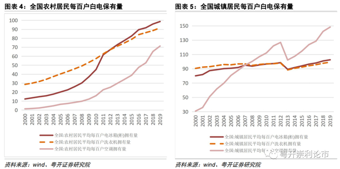 从需求层面看,家电需求主要由新增住房需求、更新换代需求两大部分组成,分别代表从无到有和升级换代两种情况。根据国家统计局数据,城镇和农村居民每百户保有量均已接近甚至超过100台,在电商下沉背景下,2018年以来农村和城镇居民白电每百户保有量显著提升,冰箱、洗衣机已经基本达到“一户一机”的水平,而空调早已进入“一户多机”时代。因此白电行业的主要需求已逐渐从新增需求向替换需求转变。