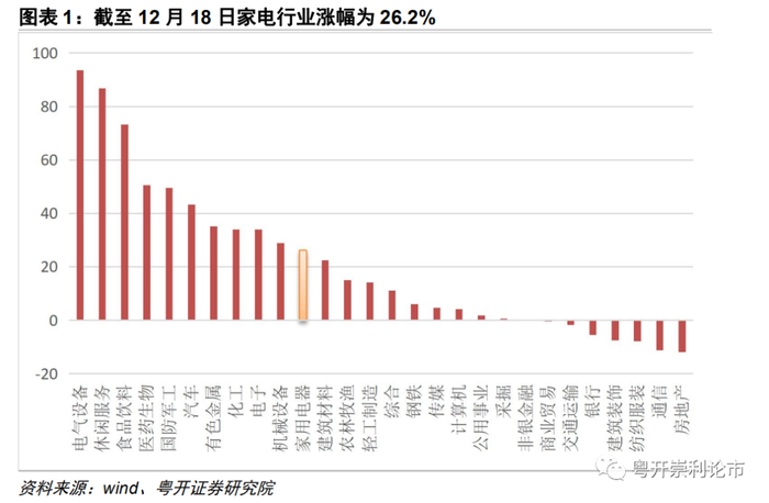 2020年家电板块先抑后扬,截至12月25日,今年家电行业涨幅达26.2%,在所有申万一级行业中排名第11位,跑赢上证指数14.8个百分点。其中冰箱板块上涨41.7%,空调板块上涨24.8%,洗衣机板块上涨35.5%,小家电板块上涨18.2%,彩电板块上涨18.1%。