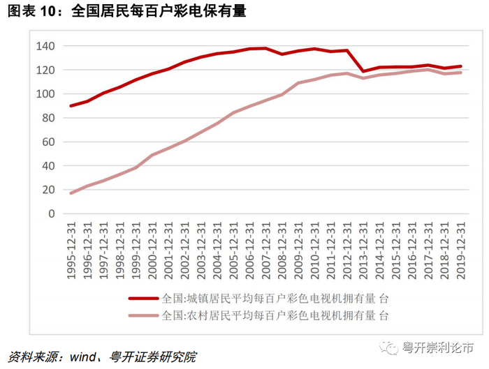 目前黑电市场环境较为严峻,市场饱和度较高。根据国家统计局数据,城镇居民每百户彩电保有量自1995年就已经接近100台,2007年底甚至已经增至137.79台的峰值,农村居民每百户彩电保有量早在2009年就已经突破100台,如今无论是城镇还是农村,彩电保有量水平基本维持不变,市场急需提振。