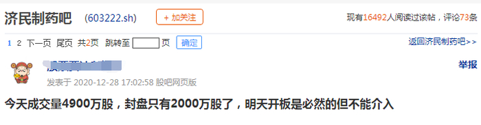 截至12月29日收盘,济民制药报14.57元/股,成交金额1.34亿元,跌停板上还有26万手封单。值得注意的是,12月28日盘中,济民制药跌停一度被密集买单撬开,随后又快速封死跌停,当日的成交金额8.1亿元,换手率达15.6%。