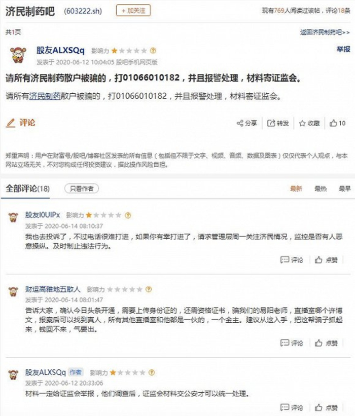 今年4月,不少投资者反映自己的证券账户被盗用,被卖出原有股票,并买入济民制药,而6月份股价闪崩时,市场上有人通过直播荐股等方式“忽悠”散户高位接盘。