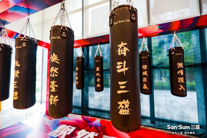 品牌焕新当日,三盛集团的全国体系,都举行正式的发布活动。其中集团所在的上海虹桥总部,更是成为了发布的核心。在三盛总部的开放大厅,通过一场别开生面的发布会让内外共同见证三盛品牌焕新的时刻。在落沪一周年这一具有特殊意义的时间节点,三盛集团董事长兼三盛控股(2183.HK)董事会主席林荣滨于会上深情讲述公司的发展历程及展望未来,多位领导层与林荣滨共同戴着拳击手套奋力锤了带有三盛精神标语的沙袋,充分展示了领导层积极奋发的精神面貌。通过落地发布会的形式,让此次品牌焕新从视觉延伸至触觉上的感知,整体体验感显著增强。