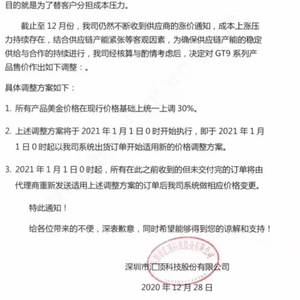 近日,国内触控IC大厂 汇顶科技 于12月28日发布产品涨价通知函,宣布自2021年1月1日0时起,将GT9系列所有产品美金价格在现行价格价格基础上统一上调30%。