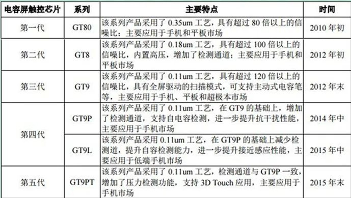 从《汇顶科技首次公开发行股票招股说明书》中查询得知,GT9 系列是汇顶科技于2012年末推出的第三代电容屏触控芯片,该系列产品采用了 0.11um 工艺,具有超过 120 倍以上的信噪比,具有全屏驱动的扫描模式,可支持主动式电容笔等,主要应用于手机、平板和超极本市场。