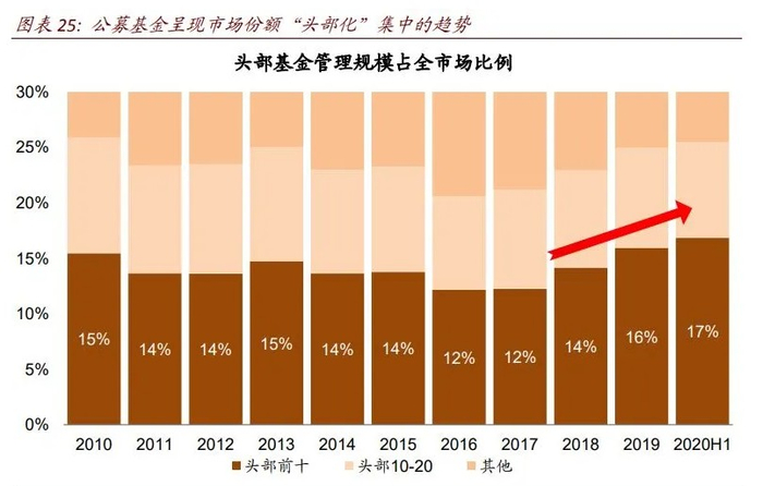 在上述投资者结构“机构化”的趋势下,另外一个非常显著的特征是,业绩突出的头部机构获取的主动管理资产份额有提升的趋势,即主动管理类资产的“头部化”特征。