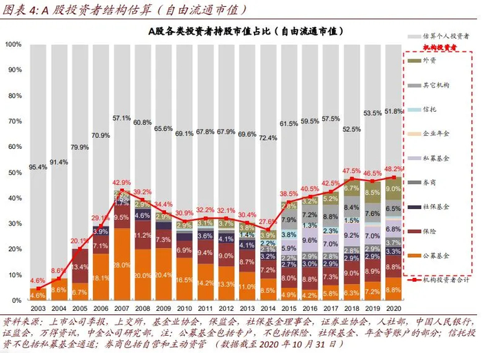 中金公司统计数据显示,个人投资者持有总市值比例已从2014年的28%下降到2020年的22%,个人投资者持有流通市值比例已从2014年的72%下降到2020年的52%。机构投资者持有总市值比例已从2014年的11%上升到2020年的21%,而机构投资者持有流通市值比例已从2014年的38%上升到2020年的48%。