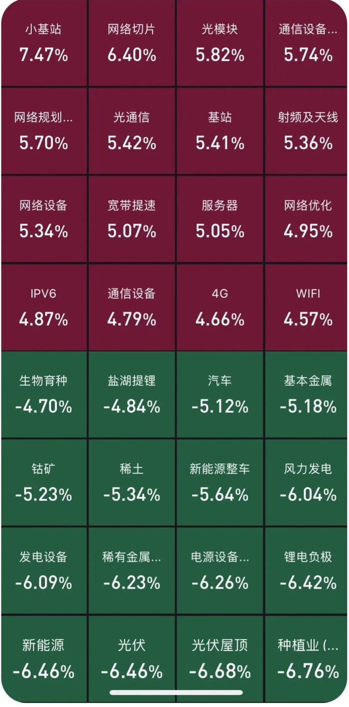 12月29日(周二)前期强势板块新能源汽车产业链、煤炭电力、光伏风电及白酒等热门板块集体下跌,而前期跌幅较深的通信、5G、游戏传媒板块大涨。