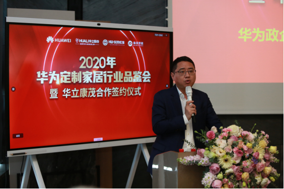 就授权推广家居行业相关华为产品,推动家居产业数字化转型与提升,以及建设数字化门店事宜,华为销售总监窦兵华与华立康茂总经理蒋越代表双方公司签订全方位的合作协议。
