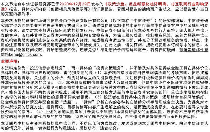 2020年12月,政治局会议和中央经济工作会议连续强调“强化反垄断和防止资本无序扩张”,我国对新经济包容审慎监管的态度或将发生改变,严监管周期可能刚刚开始。预计《反垄断法》将于2021年完成修订并正式实施,奠定完善法律基础,并强化数据、金融和税收管理。未来监管机构或通过处罚典型案例的方式,推动相关企业自发合规改造,强制拆分的可能性较低。互联网企业的商业模式可能因此而受限。