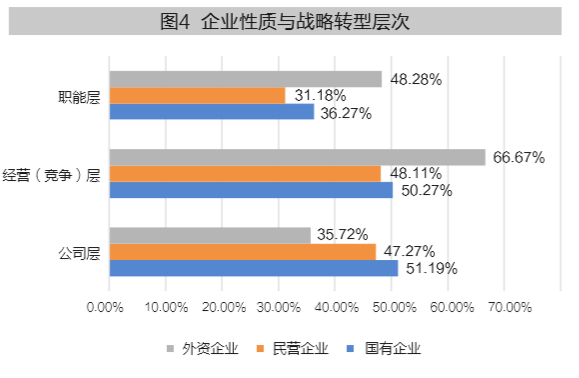 接下来,我们对转型层次进行企业性质的分组比较(图4所示)。研究结果发现,国有企业、民营企业有一个共同点,它们的公司层转型和经营(竞争)层转型接近,但是均远高于职能层转型。这一结果表明,在疫情中,国有企业与民营企业更多的是对经营领域的重新安排与调整,旨在有效应对疫情对当下产业结构的冲击与影响。然而,外资企业的经营(竞争)层转型是最高的,占比达到了66.67%,高于职能层转型的48.28%与公司层转型的35.72%。