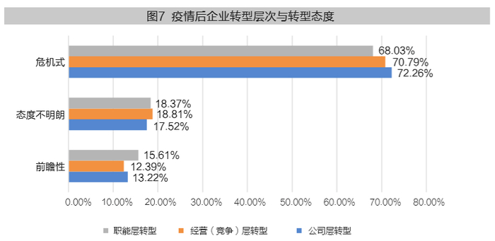 接下来,我们调查了疫情后企业战略转型的层次与转型认知态度的关联性(如图7)。总体而言,三个层次的战略转型中,前瞻性转型所占比重较低,均不到15%。大多数的转型认知仍然属于危机式,数据显示该认知在三个转型层次的比重均达到了70%左右。进一步,结果发现相比于公司层与经营(竞争)层中,转型策略属于前瞻性认知的13.22%与12.39%,职能层转型策略中是前瞻性认知的比重稍高,达到了15.61%。另外,公司层转型策略中属于危机式认知的比重为72.26%,高于经营(竞争)层的70.79%与职能层的68.03%。