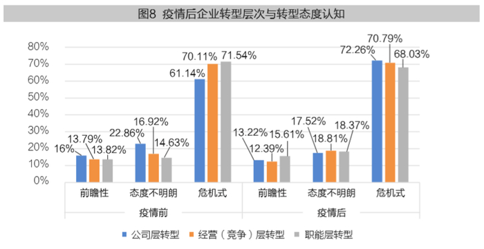 进一步,我们调查了疫情前与疫情后企业各转型层次的转型态度的变化情况(如图8所示)。结果发现,在前瞻性认知方面,公司层与经营(竞争)层转型策略中的比重从疫情前到疫情后有一定程度的降低,比重分别从疫情前的16%与13.79%,降到了疫情后的10.22%和10.39%。职能层的比重基本保持一致,为15%左右。另外,公司层转型中属于危机认知的比重有一定的上升,从疫情前的61.14%提高到疫情后的72.26%。经营(竞争)层没有明显的变化,仍然在71%左右。职能层略微下降了3.51%。