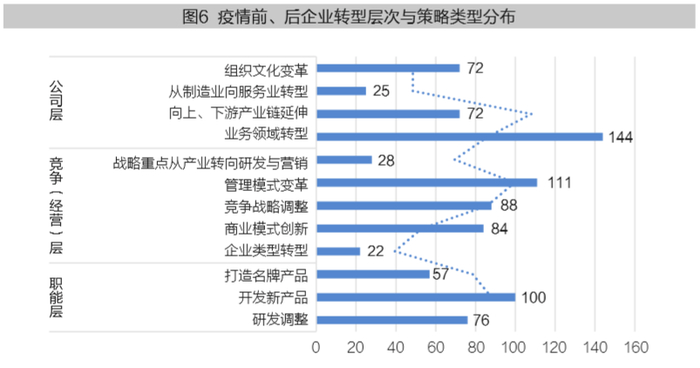 在各转型层次的具体策略分布上,调查发现(见图6所示),在公司层的转型策略上,实施最多的策略是“业务领域调整”,占公司层策略总数的46%。其次是“向上、下游产业链延伸”,占比23%。这二种策略实施的目的是类似的,都是在疫情中通过主动进入新的领域寻求发展机会。