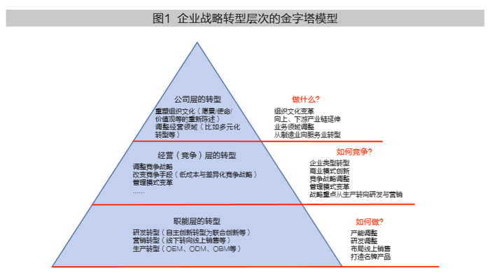 按照目前实务界的主要做法,我们仍然沿用企业战略三个层级的划分思路,将转型划分成公司层、经营(竞争)层与职能层三个层次(如图1所示)。其中公司层战略转型主要是指公司在经营领域、业务范围与组织边界的变革与调整,要解决的是“做什么?”的问题,例如产品或地域范围的扩展与缩减、公司多元化程度的调整等。比如此次疫情中很多油企、车企、家电企业快速地通过上、下游协同作战、跨界生产的方式,纷纷上马生产口罩等防疫物资,这就是一种典型的公司层战略转型,这种转型策略的实施不仅有效满足了国内供应,还为境外的国家提供了及时的援助。