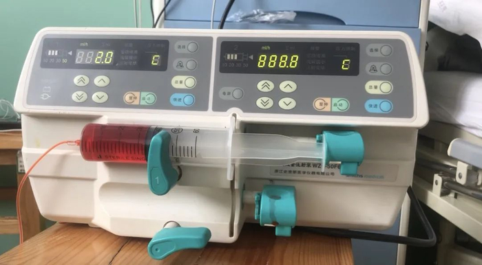 母亲化疗的药物注射泵,可以精准计算注射时间。