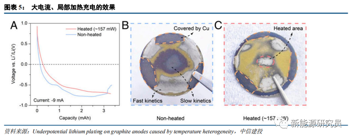 最后,研究者论述并初步验证了存在温差时大电流充电对析锂的影响:2C倍率、157mW加热使得电极中心热区析锂。而且,热区电导更高,插层、析锂均得到强化,事实上相当于锂被热富集。