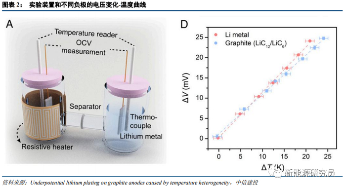 为了证实上述猜想,研究者首先设计了对比实验,用于测量不同温度下的热力学平衡电极电位:两个腔室中分别放入锂箔-锂箔和石墨-石墨电极,均配有热电偶;其中一个腔室可以加热,另外一个腔室不能加热。锂箔-锂箔、石墨-石墨的相对电压-温度曲线可由测量数据拟合得出。