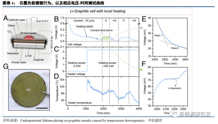 研究者进一步设计实验直接证实金属锂的析出。首先,以锂金属作为电极-参比电极,铜箔作为集流体,铂 加热器一方面加热电极,另一方面用于示温。在此实验条件下,发现了锂析出于铜箔热区表面。紧接着,在铜 集流体上涂覆石墨,同样观察到了锂金属析出于石墨热区表面。研究者已经考虑到了最小化动力学效应,分离热力学变量对析锂的影响,并且用模拟方式对上述结果进行了进一步证实。