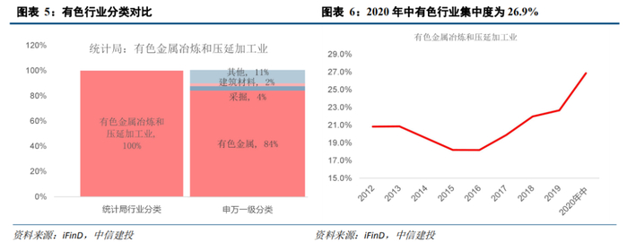 我们对比统计局行业分类(2017年)和申万一级行业分类,根据申万一级行业的标准对其进行细分,统计局行业分类中的有色金属冶炼和压延加工业主要包括申万一级行业中的有色金属、采掘业、建筑材料等细分行业。其中,有色金属占比高达83.7%。