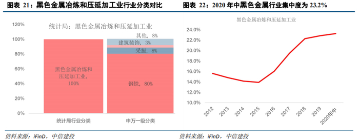 我们对比统计局行业分类(2017年)和申万一级行业分类,根据申万一级行业的标准对其进行细分,统计局行业分类中的黑色金属冶炼和压延加工业主要包括申万一级行业中的钢铁、采掘、建筑装饰等行业。其中,钢铁占比高达80%。