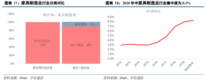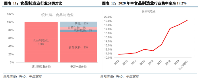 我们对比统计局行业分类(2017年)和申万一级行业分类,根据申万一级行业的标准对其进行细分,统计局行业分类中的食品制造业主要包括申万一级行业中的轻工制造和建筑装饰行业。其中,轻工制造占比高达88.9%。