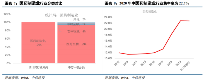我们对比统计局行业分类(2017年)和申万一级行业分类,根据申万一级行业的标准对其进行细分,统计局行业分类中的医药制造业主要包括申万一级行业中的医药生物、农林牧渔、非银金融等行业。其中,医药生物占比高达93%。