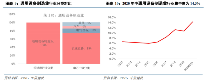 通用设备制造业的行业集中度呈现上升的总体趋势,2020年中,行业集中度为14.3%。2016年通用设备制造业的行业集中度达到低点,此后逐步回升。需要注意的是,2019年该行业的行业集中度又一次降低,2020年上半年快速回升。