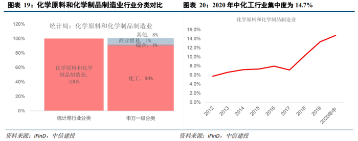 我们对比统计局行业分类(2017年)和申万一级行业分类,根据申万一级行业的标准对其进行细分,统计局行业分类中的化学原料和化学制品制造业以申万一级行业中的化工行业为主,占比高达89.9%。