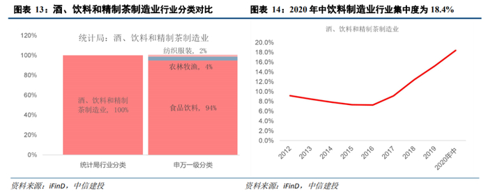 我们对比统计局行业分类(2017年)和申万一级行业分类,根据申万一级行业的标准对其进行细分,统计局行业分类中的食品制造业主要包括申万一级行业中的食品饮料、农林牧渔、医药生物等行业。其中,食品饮料占比高达74.6%。统计局行业分类中的酒、饮料和精制茶制造业主要包括申万一级行业中的食品饮料、农林牧渔、纺织服装等行业。其中,食品饮料占比高达94.3%