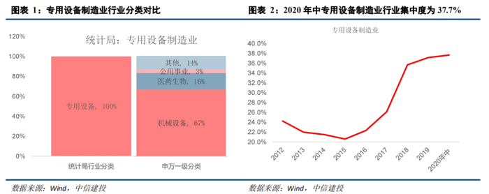 首先我们对比统计局行业分类(2017年)和申万一级行业分类,将统计局行业分类中的专用设备行业根据申万一级行业的标准进行细分,统计局行业分类中的专用设备制造业主要包括申万一级行业中的机械设备、医药生物、公用事业等细分行业。其中,机械设备制造业占比高达66.5%。