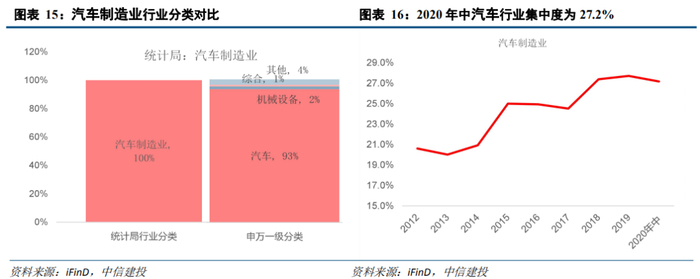 我们对比统计局行业分类(2017年)和申万一级行业分类,根据申万一级行业的标准对其进行细分,统计局行业分类中的汽车制造业主要包括申万一级行业中的汽车、机械设备等行业。其中,汽车行业占比高达93.2%。