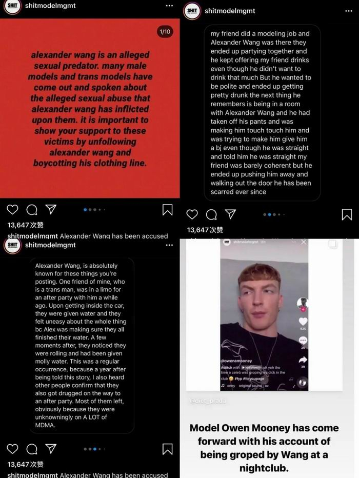 据时尚商业快讯,Instagram账号@shitmodelmgmt发布消息,男模Owen Mooney日前于Tiktok指控华裔设计师Alexander Wang曾于2017年在纽约一家酒吧对其进行性骚扰,迅速引发行业和消费者的广泛关注,并持续发酵。