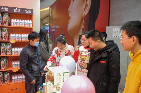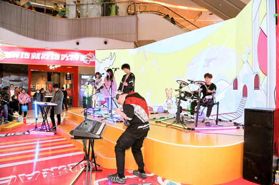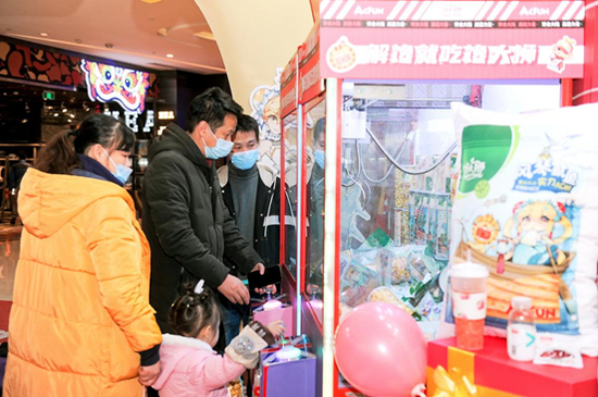 快闪店分为弹幕墙打卡、解馋百宝坊售卖区、主舞台互动区域三大主题体验区。互动区域的“食从天降”和“零食娃娃机”,给来往人群带来了别样的互动体验。