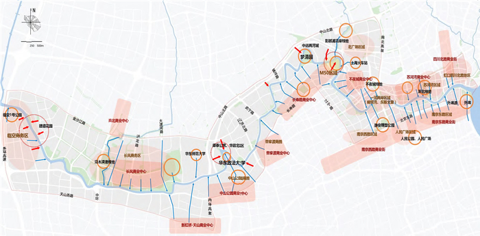 考虑到苏州河沿岸中心城段两岸大部分空间都是建成区,贯通工程大多以微更新的形式,完成各节点的品质提升和设施配套。
