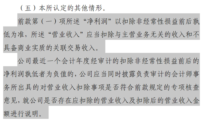 值得一提的是,针对新增“扣非净利润+营业收入”组合类财务退市指标,为避免个别上市公司通过各类行为虚增营业收入,要求其在计算时扣除虚增的营业收入。对此,退市新规进一步明确营业收入扣除项规定为“与主营业务无关的业务收入和不具备商业实质的收入”。