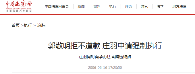 但郭敬明拒不道歉。后来,法院不得不实施强制执行。