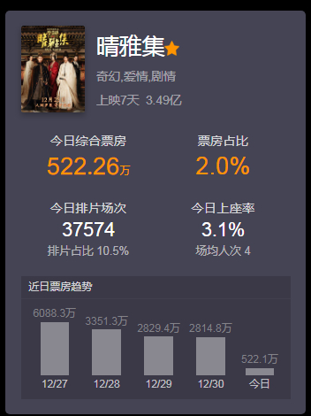 今年是郭敬明的“大年”。前有改名为《冷血狂宴》的原《爵迹2》上线视频平台,后有作为导演的《晴雅集》于12月25日上映,目前票房已过3亿元。