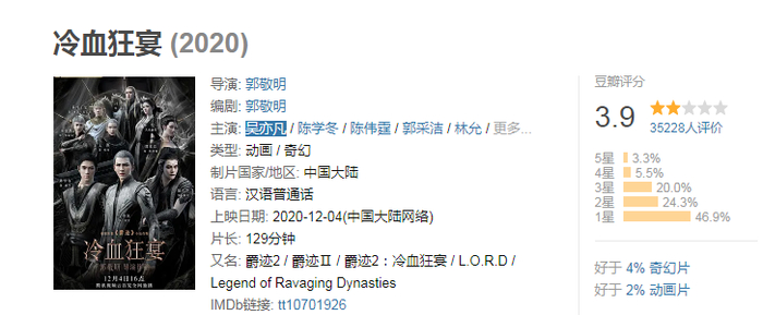 12月4日,电影《冷血狂宴》在腾讯视频上“云首发”,观众需付费观看,VIP优惠价为12元,非会员价为24元。猫眼专业版显示,截至12月31日,该影片在腾讯视频播放1.03亿次。播放量赢了,口碑却输了。豆瓣评分则显示,《冷血狂宴》得分为3.9,近47%的观众打了最低的1星。