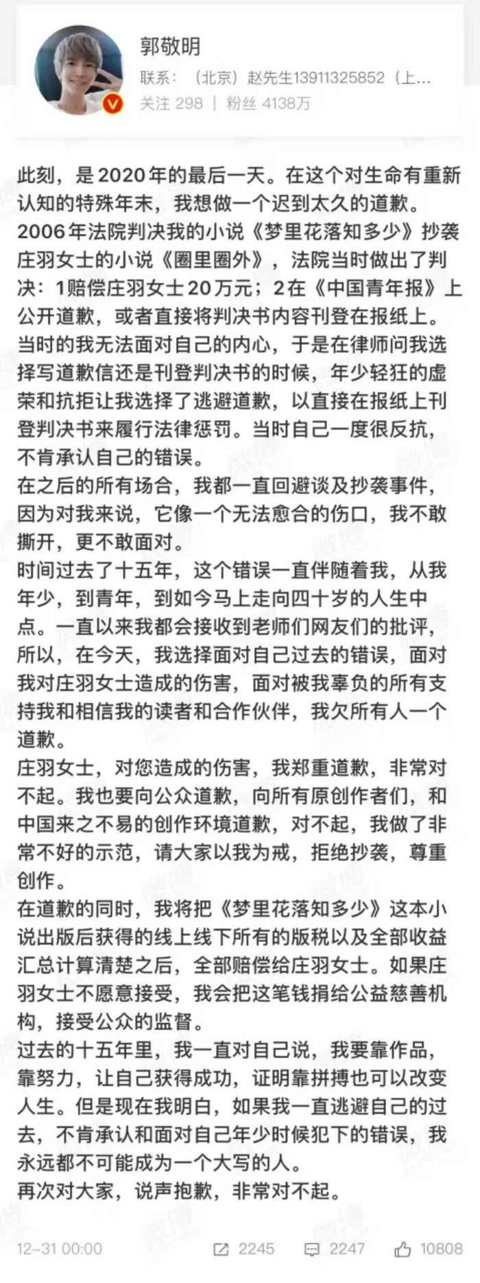 郭敬明凌晨0点发文承认抄袭公开道歉 逃避了15年