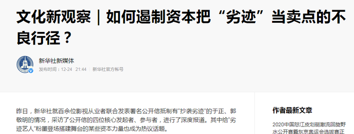 12月24日,新华社继续追问:谁在给“劣迹艺人”提供粉墨登场的舞台?如何遏制资本把“劣迹”当卖点的不良行径?资本以及某些竭力为“劣迹艺人”粉饰的媒体应承担哪些责任?